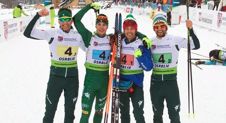 L’Italia ha schierato al lancio Michael Durand (Cse; 19’29”8; 0+0 0+0), che fa registrare il settimo tempo parziale e porta gli azzurri al cambio in settima posizione, a 51”7 dai capofila del Kazakhstan (poi classificatosi 15° ). Il testimone passa a Patrick Braunhofer (20’15”8; 0+1 0+1), miglior crono parziale e Italia che risale al secondo posto, con un ritardo di 14”7 dalla Germania, ma le prime sei Nazioni sono racchiuse in una quarantina di secondi. Terza frazione è affidata a Cédric Christille (Fiamme Gialle; 20’55”6; 0+1 0+0) e azzurri al terzo posto, attardati di 20”0 dalla Russia. È Daniele Cappellari (19’34”1; 0+0 0+0) a ‘chiudere’ il quartetto con il miglior tempo di frazione e le posizioni sul podio si decidono in volata.
