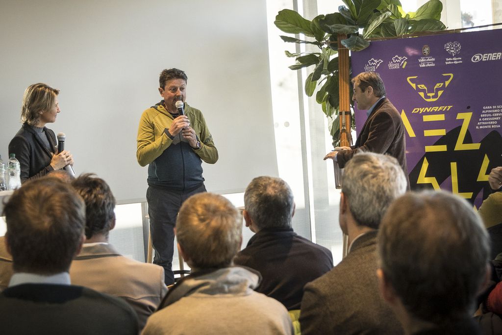 Dopo i saluti del presidente della Fondazione, Alex Brunod, si è entrati nel vivo della presentazione con gli interventi dei partner Dynafit ed Enervit. Per Dynafit, main sponsor del Trofeo era presente Lukas Naegele.