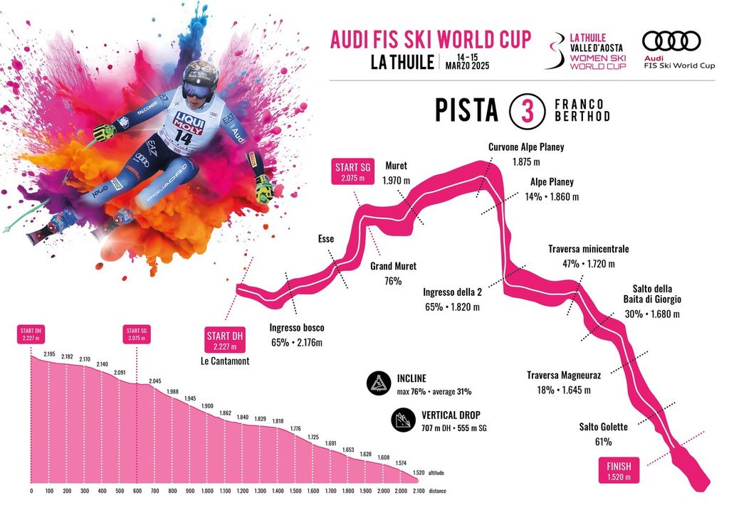 L’attesa si fa ancora più in grande e interessante. Cambia parte del programma ufficiale, aumenteranno però spettacolo e adrenalina, perché la campionessa Federica Brignone - che vive nella vicinissima La Salle - avrà addirittura tre gare davanti al pubblico italiano, pronto a sostenerla e fare il tifo nella discesa in cui vestirà il pettorale rosso di leader e nei due superG che saranno altrettanto cruciali per la coppetta di specialità.