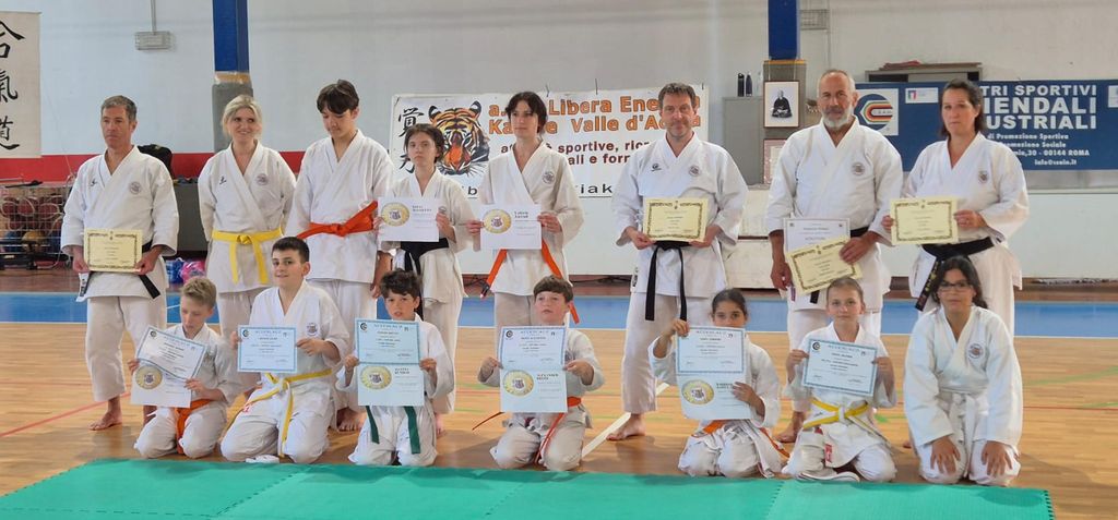 Dopo l’intenso momento formativo, si è svolta la cerimonia di premiazione e consegna delle cinture agli allievi che hanno superato gli esami di grado (Kyu per le cinture colorate e Dan per le cinture nere), sia nel karate che nell’aikido. Ecco l’elenco dei premiati: